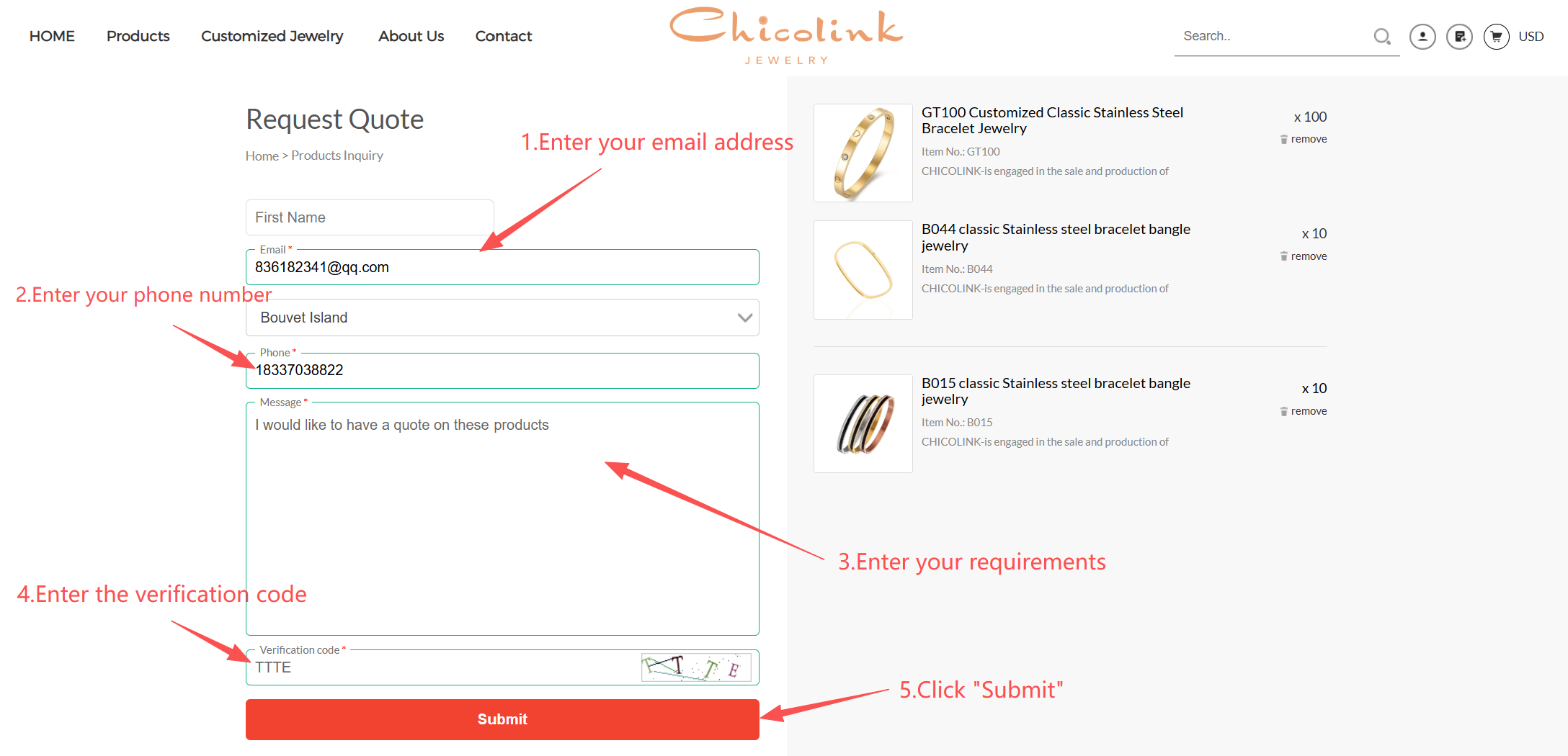 6.Please fill in your email address, your phone number, your requirements, and finally enter the verification code and then click "Submit" to complete the process.